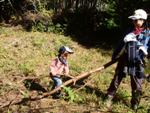 Tくんよりずっと大きい木の枝を見つけてひっぱりました。