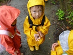 たどり着く前からお腹空いた~と言っていた子は、到着して早々、カッパは上着だけ脱いですばやく昼食の準備をして食べはじめました。