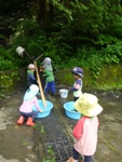 子ども達の目線からでも水の流れが見えるので、出口にタライを置いて水を貯めたり、