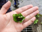 コガネムシが葉っぱの上でじっとしており、子ども達が指先でちょんちょん押しても動きません。