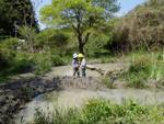 この二人、どろどろの中にいて、長靴でぐにゅぐにゅするのが楽しいねって何かおもしろいことを相談中。