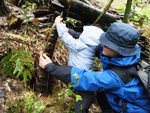 上手に丸太をだっこして、後ろ向きで降りて行きます。