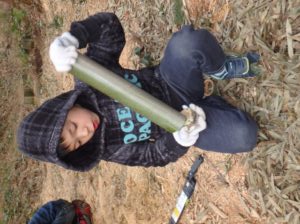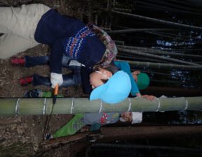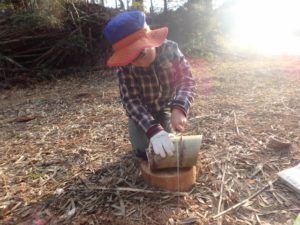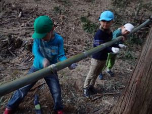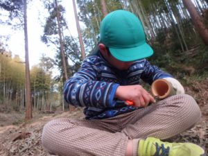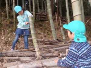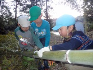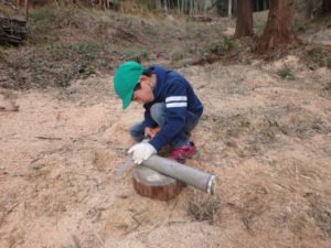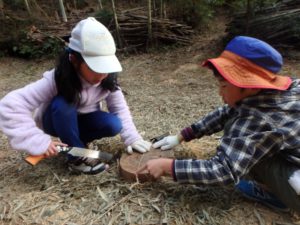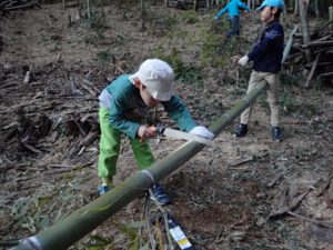 ナタはとっても危険だから、ちかりんが竹に当てて、子どもが上から木槌でトントン!
