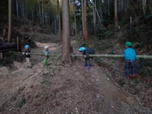 チームで力を合わせて、ものが作れるように枝のほうを切り落とします。