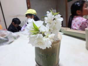 あの竹の花びんには、ちゃんと桃の花が飾られています。
