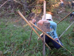 1年生が竹を運んできて3年生に渡します。