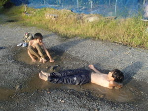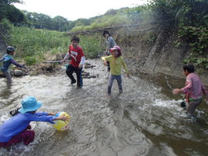 日暮れまで里山で思いっきり遊ぶ川辺の光景は、懐かしい昭和の風景です。