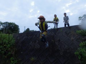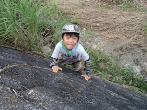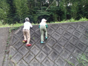 わずかなコンクリのデコボコに手とかけ足をかけ、頂上までチャレンジです。