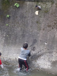 水のかけあいに圧倒された子たちは、喧騒から逃れて壁登り。