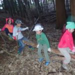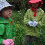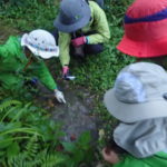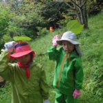 雨が降ってもなんのその。「雨の森の面白いところを探そう!」レインコート装備で出発です。
