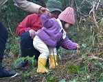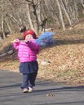 忘れ物の虫網で、落ち葉のお魚釣りごっごを