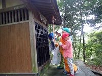 山の神様の前では、「たけのこをもらいました、ありがとう」とお参り。