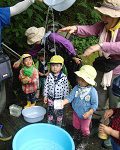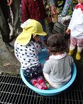 水遊び、いつも大人気で、桶の取り合いになっちゃうので
