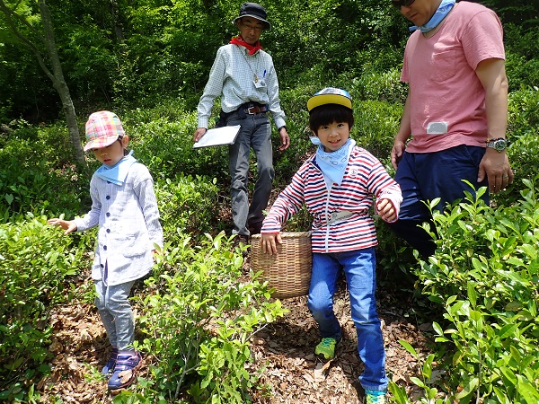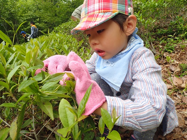 「一芯二葉」の摘み方で、親子一緒に摘みました。