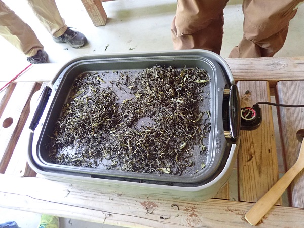 いたんだ葉やゴミを除いて、せいろで2分ほど蒸してホットプレートに広げ、保温温度で軽く炒りながら水分を飛ばします。