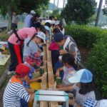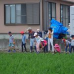 ジャンボタニシの卵にも興味津々でした。畑に戻り、きゅうりやなす、トマト、サツマイモの葉を見ながら、少し雑草取りをするグループもありました。