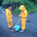 いかだの時のように、葛でロープというアイデアも出たけれど、蔓が切れてバケツが流されるしまうということで、特別に化繊ロープ使用OKとしました。