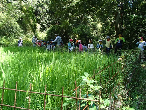 朝のセレモニー後、まず田んぼに移動し、稲の成長を観察。