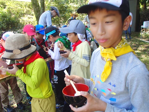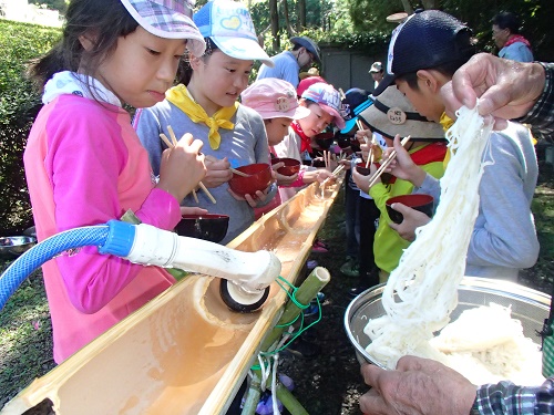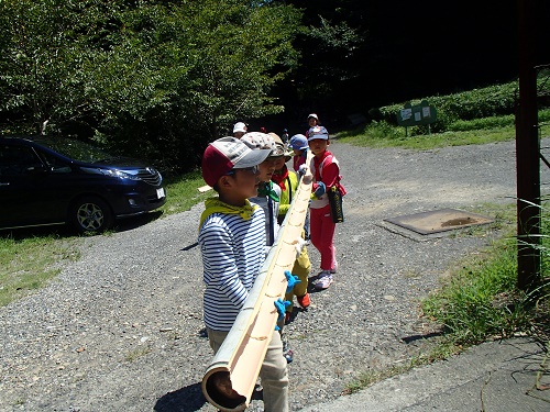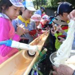 昼食は流しソーメン、ミニトマト、皆が持ってきてくれたゼリー、ソーセージ、 など色々なものを流し楽しみました。