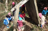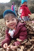 Kくんがママに落ち葉のお布団をかけてもらっていると、
