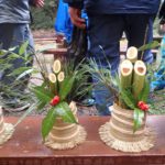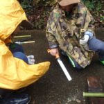 あらかじめ下見で千両、梅、竹の準備しておいたので、子どもたちは真竹で3本の斜め切りをし、保護者は孟宗竹で土台を切りました。