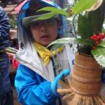 少し雨が降り出したため、カッパを着て門松つくり用の松、竹笹を取りに青空広場に移動。