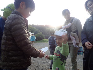 火起こししてカートンドッグを作る班は、参加者が薪を拾って物々交換。