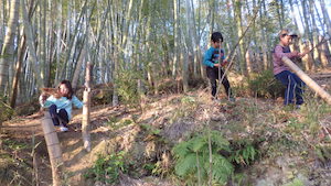 お客さんは裏の竹林に駆け上がって材を採りに行きました。