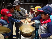 みんなできのこスープ作り。