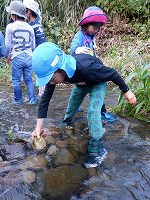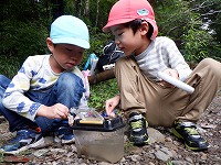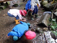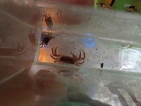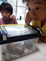 サワガニを捕まえて、ケースに入れ、みんなで上から観察していると・・・