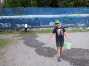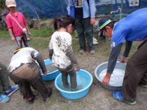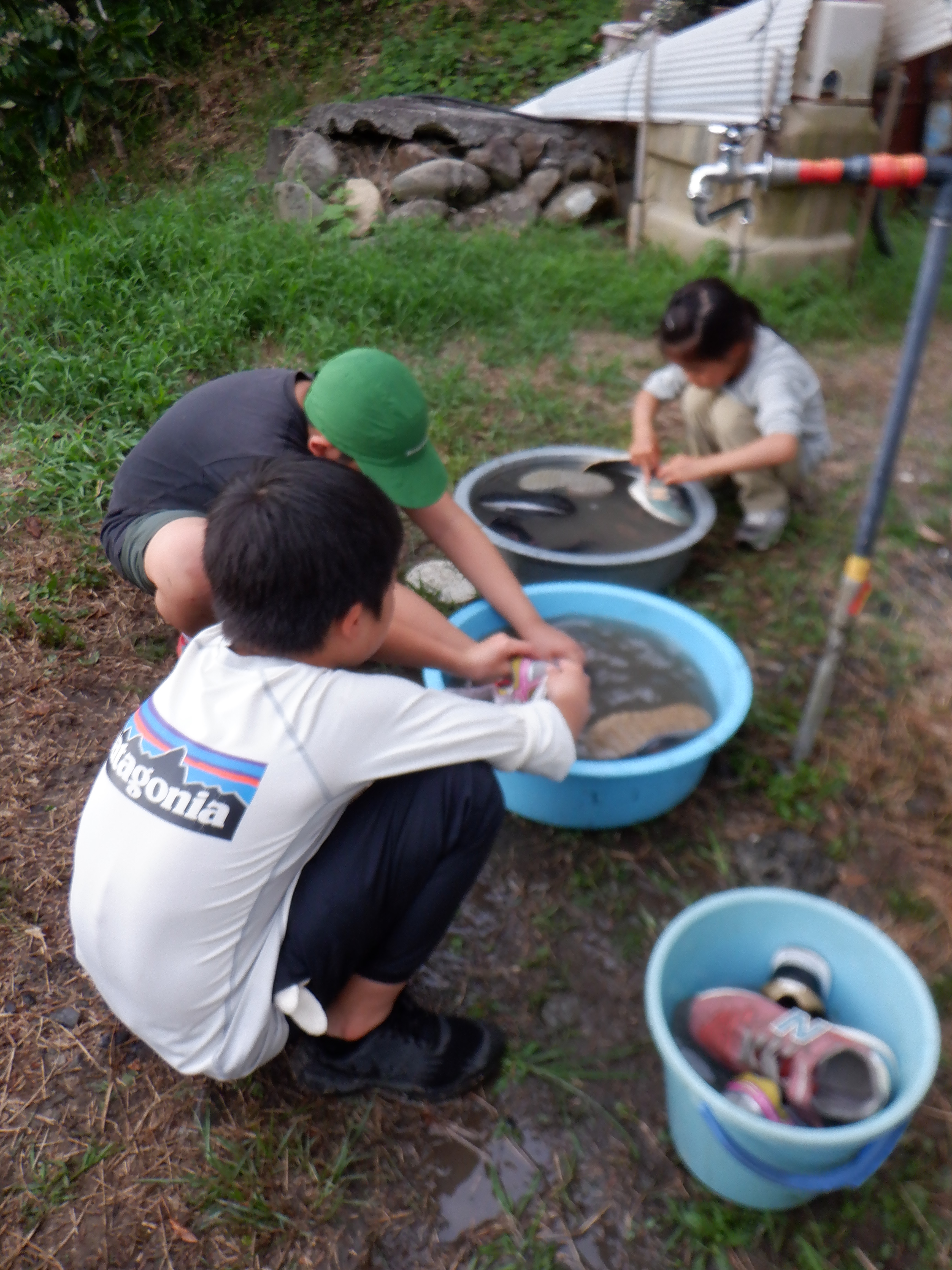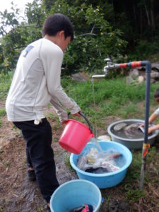 走って帰った中学生のジュニアスタッフがたらいに水を汲んで待っていてくれた。