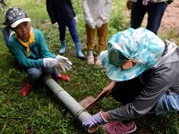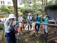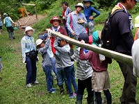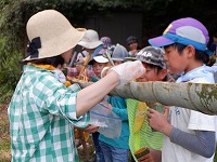 竹を切り、子ども達は流しそうめんのコップと箸を自分で作り、大人はトイを作りました。
