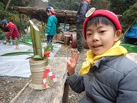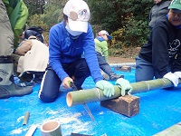 スタッフの指導で竹切りから始めます。