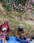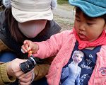 食後の遊びで、フクシアのお花を見つけたHちゃん。