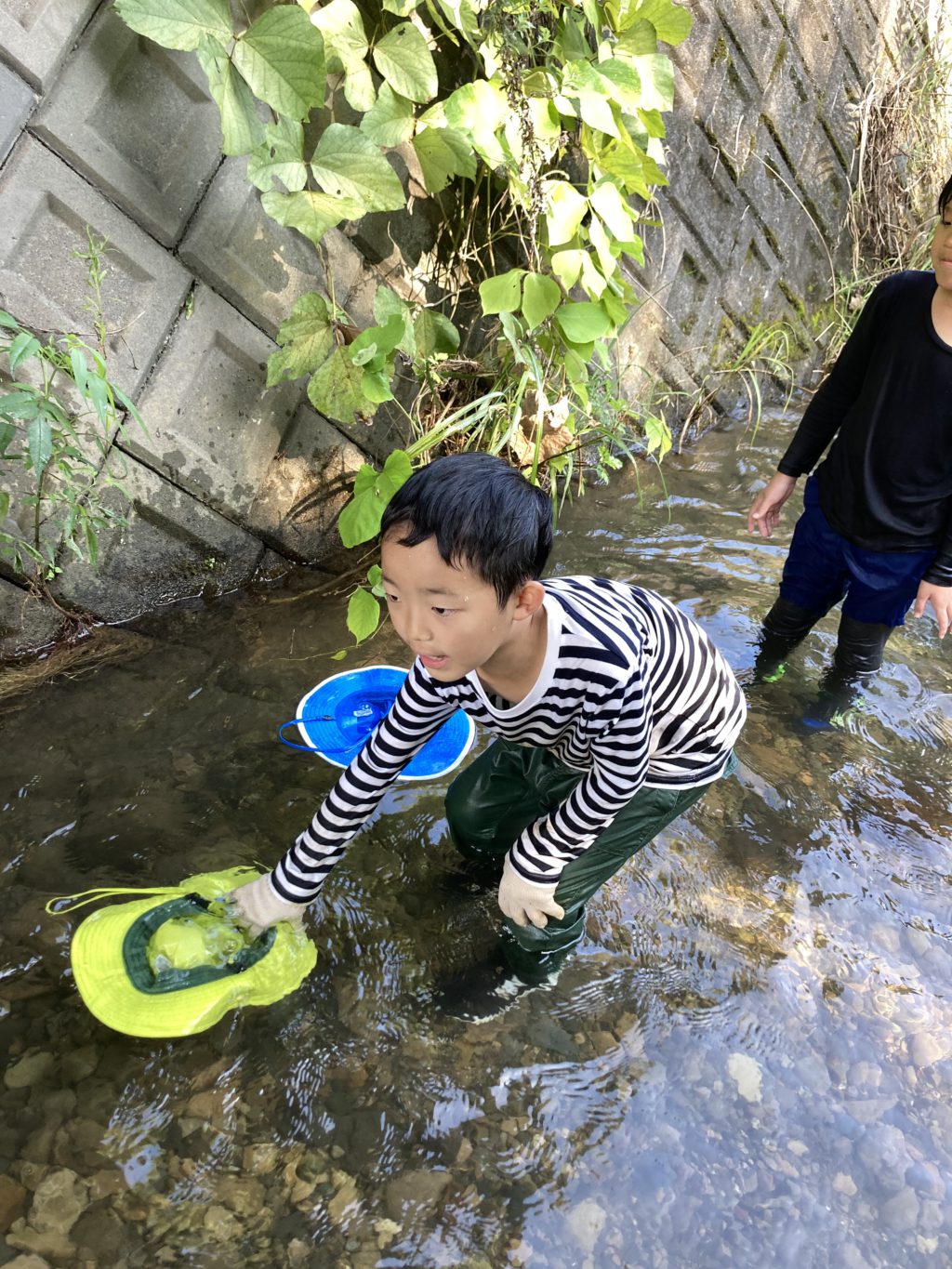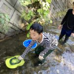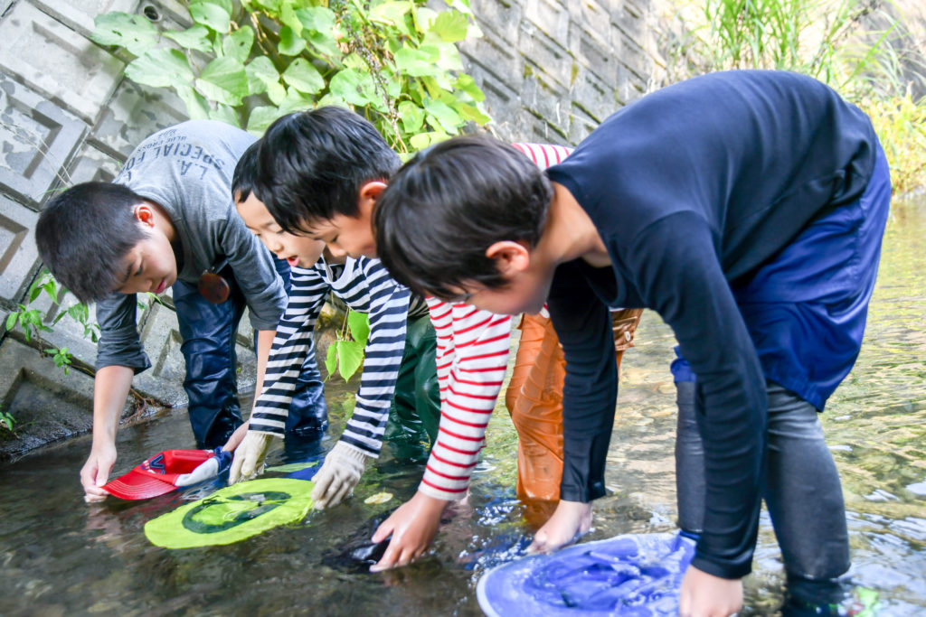 ダム作りが終わった1~2年男子グループの1人が自分の帽子を川に流しはじめ、