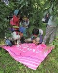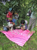 みんなで、力を合わせて、木をゆすってクワの実を落としてみました。